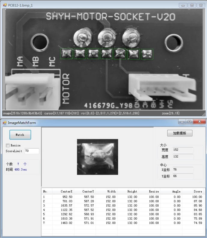 3、在图像上鼠标长按框选要匹配的模板,如下,选择一个焊点为模板: